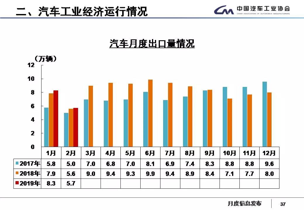 2月,汽车出口继续呈现增长,当月,汽车企业出口为5.7万辆,比上月下降30.9%,比上年同期增长2.3%。分车型看,乘用车本月出口3.6万辆,比上月下降32.8%,比上年同期下降10.8%;商用车出口2.1万辆,比上月下降27.6%,比上年同期增长36.9%。