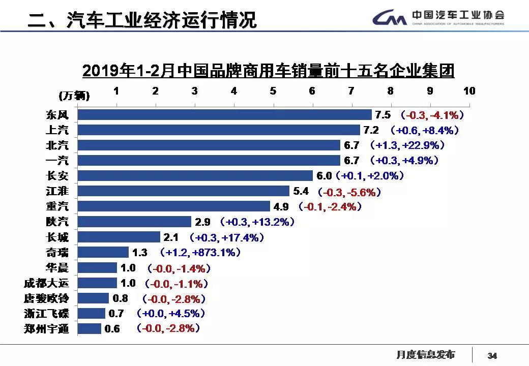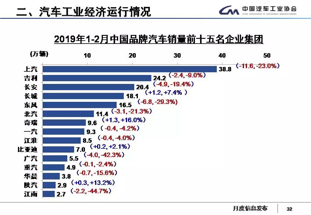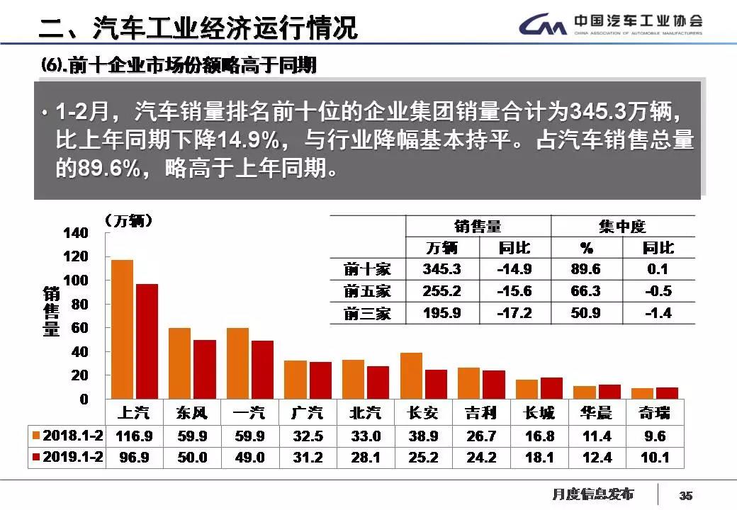 1-2月,汽车销量排名前十位的企业集团销量合计为345.3万辆,比上年同期下降14.9%,与行业降幅基本持平。占汽车销售总量的89.6%,略高于上年同期。