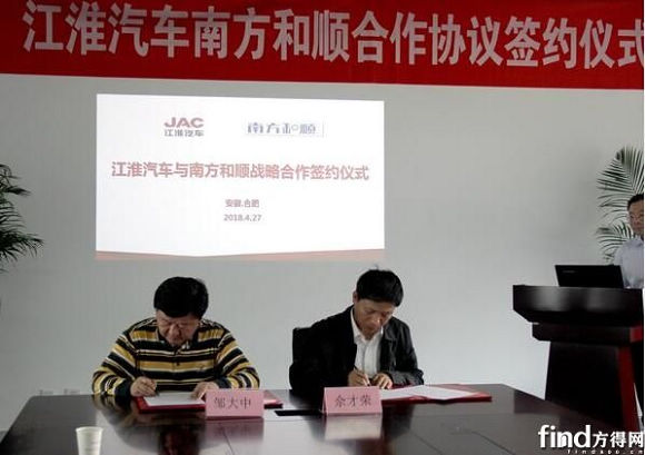 4月27日,安徽江淮汽车集团与南方电网旗下深圳南方和顺电动汽车产业服务有限公司在安徽江淮新港基地正式签署战略合作协议,江淮汽车副总经理佘才荣与南方和顺公司总经理邹大中等出席了签约仪式并进行了座谈交流。