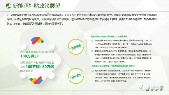 2019版新能源汽车补贴政策变化符合预期设定,实现了从补贴推动转向市场选择的发展趋势,补贴时间段能拉动市场走势,这也使2019年的新能源汽车发展好于预期,预计新能源汽车全年销量将达到180万辆。