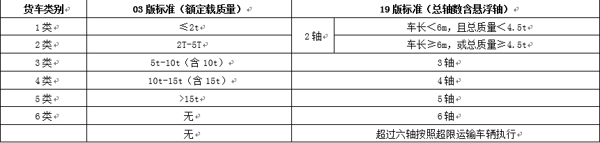 5月30日,交通运输部发布了修订后的新版《收费公路车辆通行费车型分类》标准,明确了货车主要按照总轴数分类,2轴蓝牌货车为一类货车,2轴黄牌车为二类货车,三轴为三类,四轴为四类,五轴为五类,六轴为六类,六轴以上根据车辆总轴数按照超限运输车辆执行。
