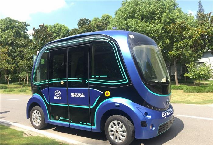 行驶在汽车博览公园的苏州金龙无人驾驶巴士深蓝