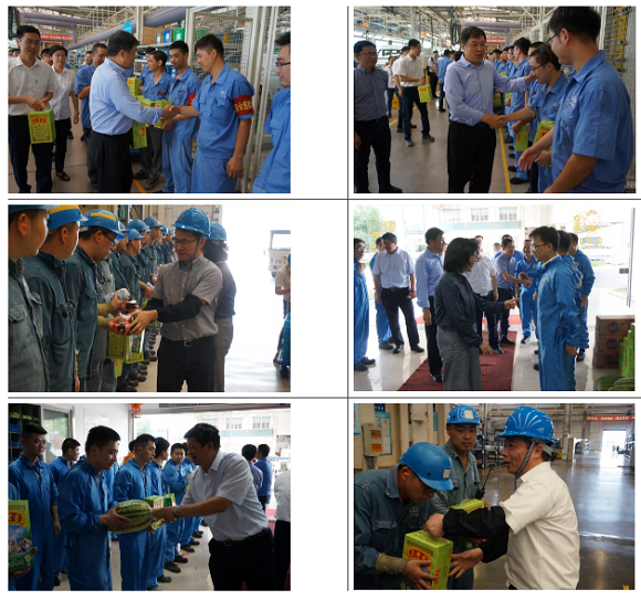 “炎炎日正午,灼灼火俱燃”,正值流火季节,无锡基地生产车间内却依旧是一派繁忙的景象。仪式过后,蓝总,公司、工会领导和制造部门领导一同亲切慰问奋战在生产一线的员工,为他们送上一份清凉与关爱。