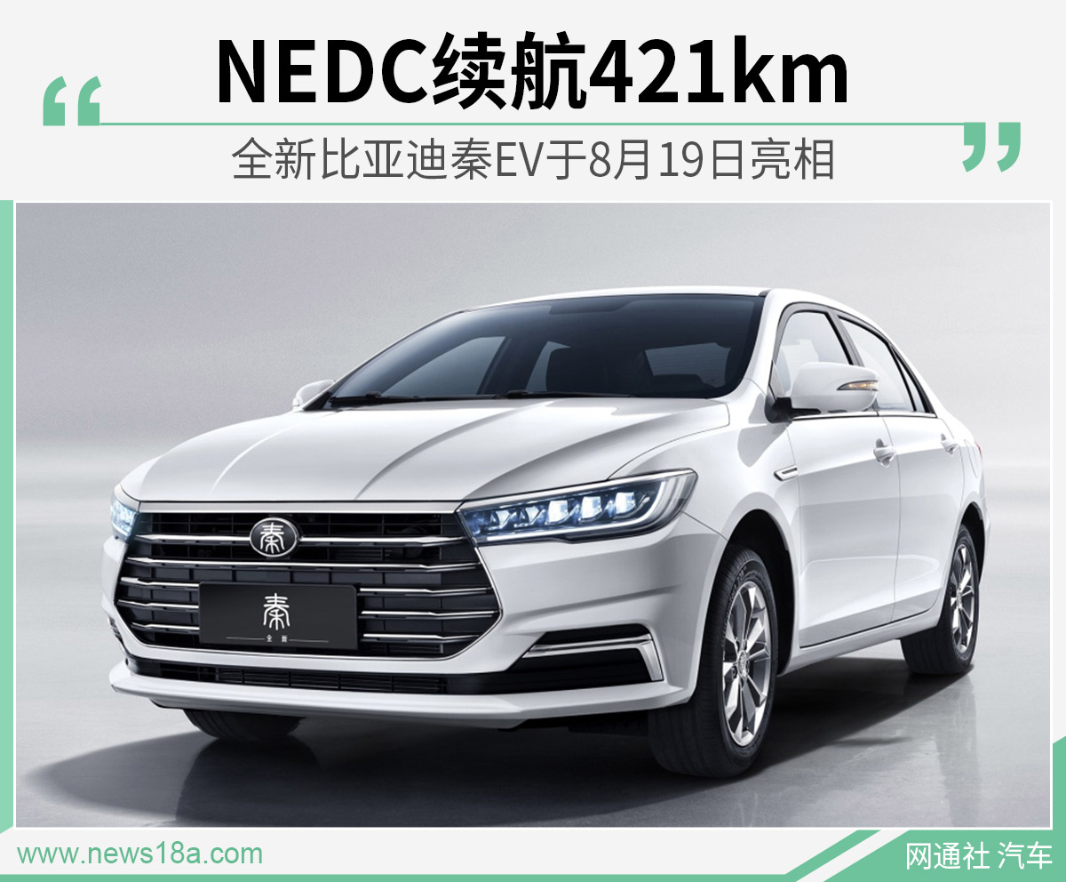 秦EV是比亚迪旗下纯电动紧凑型轿车,全新一代车型基于BNA架构e平台打造。网通社从比亚迪官方获悉,全新比亚迪秦EV将于8月19日正式亮相。新车整体造型与现款秦Pro车型较为相似,并搭载DiLink智能网联系统。动力方面,新车电机最大功率100千瓦,NEDC工况续航里程达421公里。