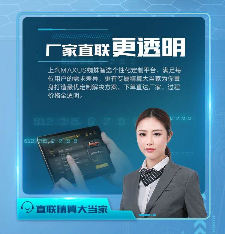 既想私人定制上汽MAXUS D90 Pro又想价格更透明,不被套路“赚差价”?上汽MAXUS蜘蛛智选个性化定制平台,满足每位用户的需求差异,更有专属精算大当家为你量身打造最优定制解决方案,下单直达厂家,过程价格全透明。