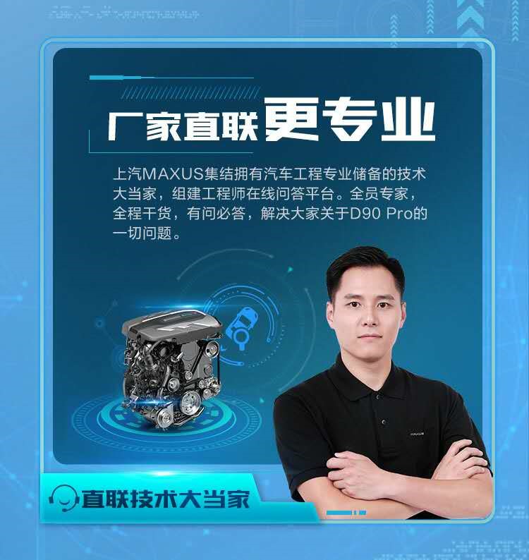 想要深入了解上汽MAXUS D90 Pro关于动力、外观、内饰、配置和产品使用方面的各类问题?上汽MAXUS集结了拥有丰富汽车工程专业背景的技术大当家。200多位专业汽车工程师,对发动机、底盘驱动桥、传动轴、分动器等专业技术知识捻熟于心,通过工程师问答平台与用户在线直联互动,专业解答用户关于D90 Pro的的一切问题,全员专家,全程干货,有问必答。