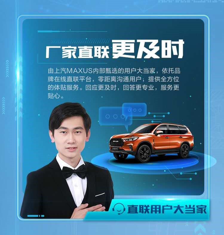 由上汽MAXUS内部甄选的用户大当家们,依托品牌在线直联平台,从用户开始触达品牌开始,到整个选车、买车、用车全链路,为用户提供全程一对一VIP服务,7X24小时随时在线,第一时间响应用户的任何需求和问题,快速、专业、贴心、无忧。