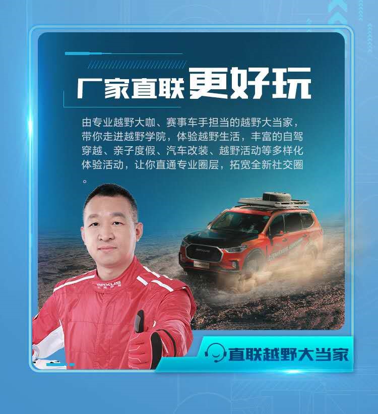 想玩转越野,融入向往的汽车生活圈?来自上汽MAXUS越野学院,由越野大咖、专业车手组成的越野大当家团队,为用户提供专业的越野穿越、赛道竞技、自驾出行实地教学体验和培训,带领用户进入汽车越野生活圈层,为用户找到志同道合的兄弟伙伴,共同加入丰富的硬核越野、自驾穿越、亲子度假、汽车改装等文化体验活动中,让用户充分体验到,选择D90 Pro不仅仅是选择了一辆车,更是选择了一种不一样的生活方式。