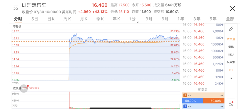 2020年7月30日,北京时间晚上9点30分,理想汽车正式在纳斯达克敲钟上市,成为继蔚来汽车之后第二家登陆纳斯达克的中国造车新势力企业。值得一提的是,理想汽车开盘股价一度涨逾50%,直至当日美股收盘,股价仍保持43.13%涨幅,报价16.46美元,总市值达139.17亿美元。