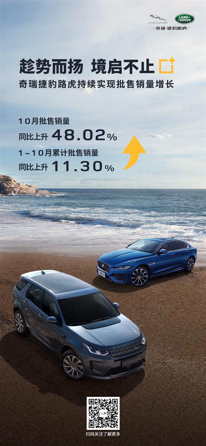 今年10月奇瑞捷豹路虎批售销量同比提升48.02%,1~10月累计批发销量同比提升11.3%。这已经是奇瑞捷豹路虎今年第7个月销量连续增长。