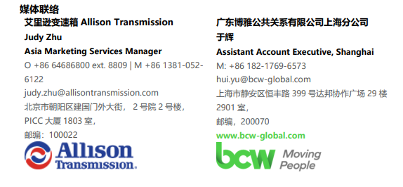 艾里逊变速箱(纽约证券交易所代码:ALSN)是领先的商用车和特种车辆驱动解决方案的设计商和制造商,是全球最大的中重型商用车全自动变速箱制造商,同时也是改善世界动力领域运作模式的电动驱动系统领域的领先者。艾里逊变速箱为多种车型配套,包括公路卡车(配送车、环卫车、建筑车辆、消防和应急车辆)、客车(校车、城市公交和长途客车)、房车、非公路车辆和设备(能源、采矿和建筑应用)。艾里逊成立于1915年,总部设立于美国印第安纳州首府印第安纳波利斯市。艾里逊变速箱公司产品远销150多个国家,在荷兰、中国和巴西设有区域总部,并在美国、匈牙利和印度设有工厂,以及拥有全球工程资源,包括位于印第安纳州的印第安纳波利斯、密歇根州的奥本山和英国伦敦的电气化工程中心。艾里逊变速箱公司在全球拥有近1,400家独立分销商和代理商。如需了解更多详情请访问allisontransmission.com。