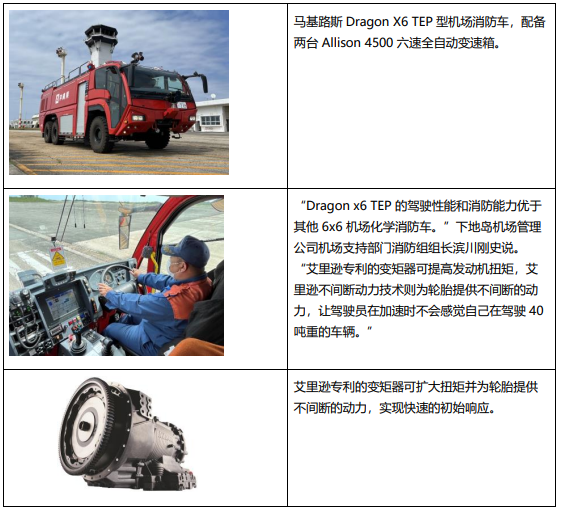 机场化学消防车。”机场管理公司支持部消防组组长滨川刚史说。他表示,艾里逊专利的变矩器可提高发动机扭矩,艾里逊不间断动力技术则为轮胎提供不间断的动力,让驾驶员在加速时不会感觉自己在驾驶