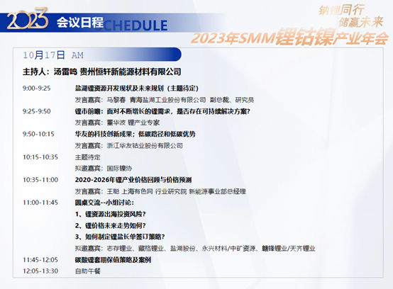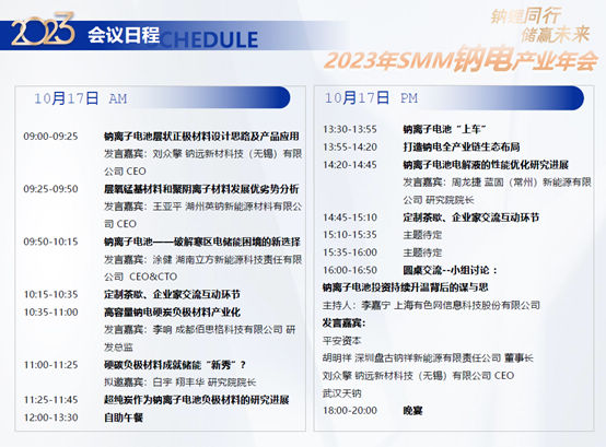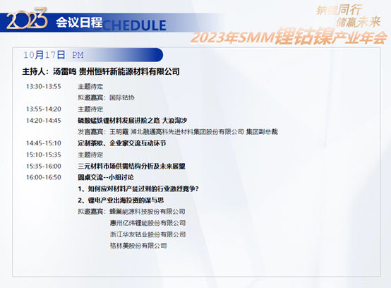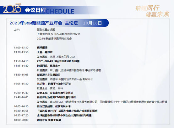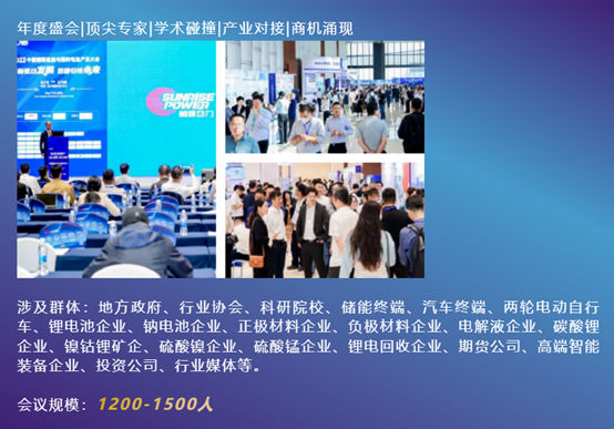 年会将于2023年10月16日至18日举行。本次论坛将涵盖镍、钴、锂、钠电及储能板块,这些板块均是新能源产业链的重要组成部分,也是驱动新能源产业发展的核心要素。本次论坛将邀请来自国内外的行业领导、专家学者、企业代表等,共同分享行业最新动态、技术创新和市场趋势,探讨新能源产业发展面临的机遇与挑战。大会将包括主题演讲、分论坛、展览展示和交流互动等环节。与会嘉宾将有机会与新能源领域的专业人士进行深入交流,共同探讨合作机会,加强行业合作,共同推动新能源产业的健康发展。