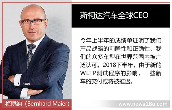 “今年上半年的成绩单证明了我们产品战略的前瞻性和正确性,我们的众多车型在世界范围内被广泛认可。”斯柯达全球CEO梅博纳(Bernhard Maier)说。“2018下半年,由于新的WLTP测试程序的影响,一些新车的交付或将被推迟。”