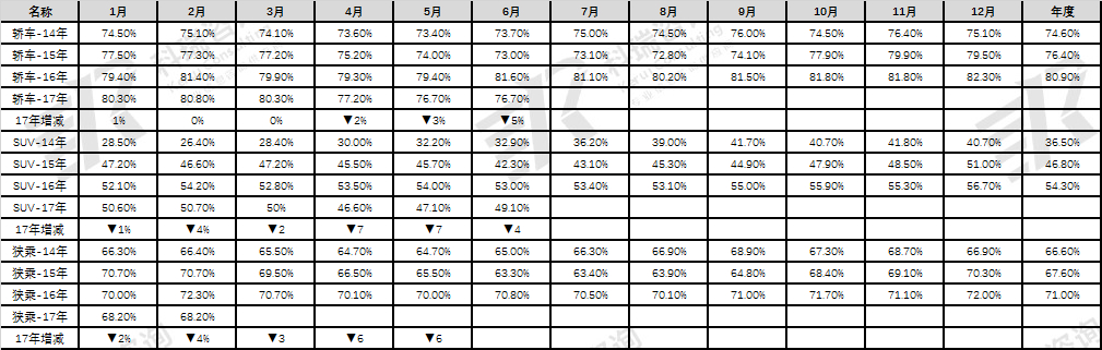 17年6月的自主份额超强增长仍较强。17年自主份额高企主要也是合资的市场表现较差,商务需求和换购需求不足,自主的新购需求相对较稳,导致自主的表现借助SUV异常超强。2月份额达到46.5%的高点,3-6月逐步下滑,这与历年走势基本一致。但6月的自主环比下降是0.2个百分点,好于16年的1.3个百分点较多。