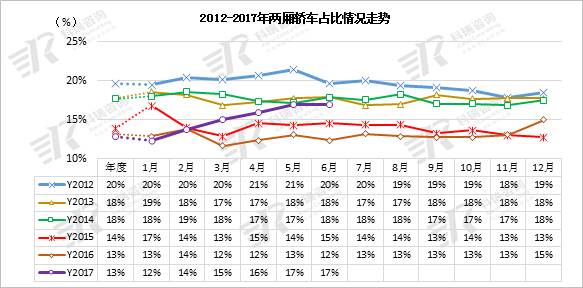 伴随SUV的高增长,轿车的中低端相对萎缩,11-16年的轿车的两厢占比持续下降。但随着丰田的小型车战略推动和自主的小型车恢复,17年小车市场恢复,6月的两厢占比回升到17%。