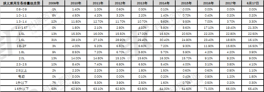 8、6月狭义乘用车排量小型化