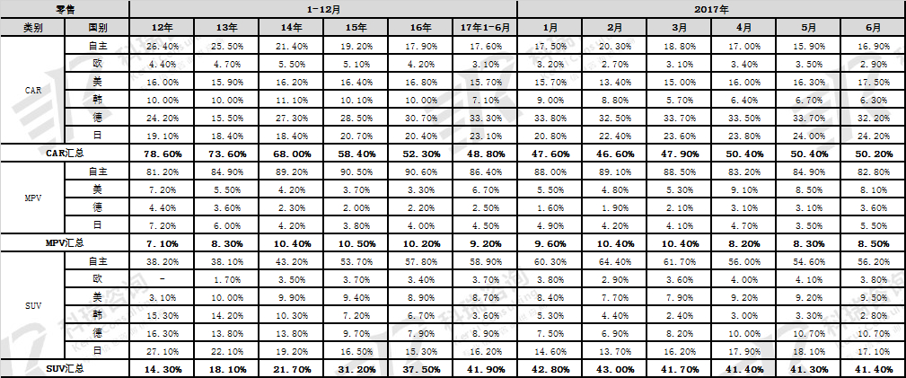 17年自主品牌在SUV市场获得巨大的份额增长,从58%上升到59%,而德系的SUV份额逐步稳定,韩系锐减,日系SUV走强,这也是巨大的反差。而自主品牌在轿车市场的份额从17.9%下降到17.6%。17年6月的这种趋势仍在延续。德系在轿车份额提升到33%的历史新高,欧系轿车在6月萎缩到3.2%的低位。日系轿车回暖态势在17年持续,高于13-15年表现,