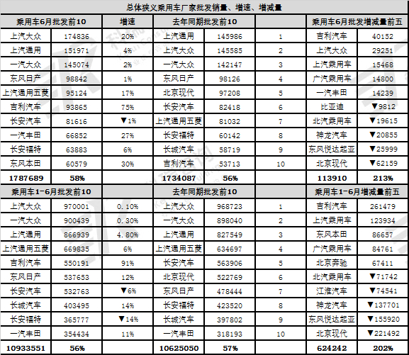 6月部分企业的销售与生产反差较大,销量环比下降较大,且生产相对减速。这也是对1季度开门红的批发后的6月调整压力较大。吉利、长安、东本的批发表现较好。