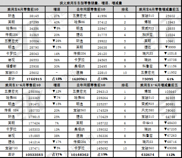 6月的车市销量批发增量较高,主力车型的销量贡献度不大,6月前10名主力车型的销量占比低于年度水平。17年的前10名主力车型中有宏光、H6和宝骏510、传祺GS4等是自主品牌,但宝骏560退出。而从增量看,6月的SUV增量表现突出,MPV增量表现弱于前期。小型SUV的宝骏510等表现较强。