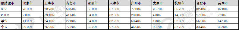 1-5月,前十城市市场份额占73.6%;限牌城市(北京、上海、深圳、杭州、天津、广州)中,仅上海插电车型占比高于纯电车型,仅广州单位用户比例高于个人。