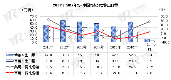 2017年1-2月,乘用车和商用车双双实现增长,其中乘用车成为汽车出口增长的主要动力,累计出口8.4万辆,同比增长56.2%,商用车市场促底反弹,累计销售3.9万辆,同比增长7.6%。