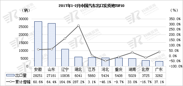 2017年1-2月,安徽和山东两地出口量遥遥领先,累计出口量分别为28251辆和27151辆,同比增幅分别为60.6%和64.4%;湖北和辽宁出口量实现暴增,增幅分别达到164.8%和287.2%;河北、重庆和北京出口量出现同比下滑,同比降幅分别为-46.1%、-9.7%和-16.7%。