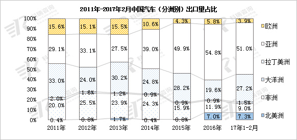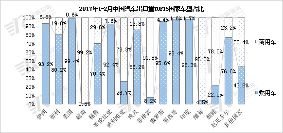 2017年1-2月,伊朗、智利和美国位居中国汽车出口量前三名,三个国家乘用车和商用车出口量均实现同比增长,其中出口美国乘用车销量暴增595.7%。