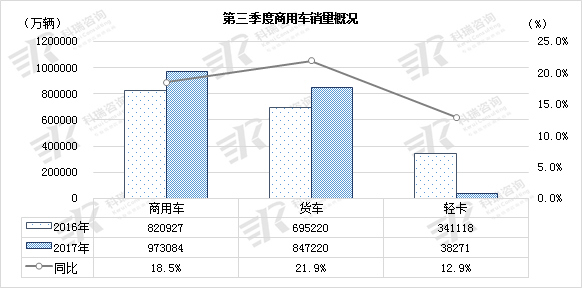 从三季度来看,商用车整体出现18.5%的高增长,由于重卡行业的持续火爆,出现货强客弱的形势发展,轻型载货车则稍微落后于整体,实现将近13%的正增长。