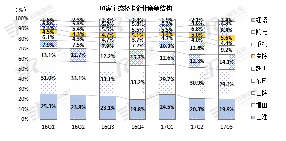 总体来说,2017年三季度轻卡市场维持稳定增长,行业竞争集中度在提升的同时,外来竞争在不断加剧,刺激行业结构调整。