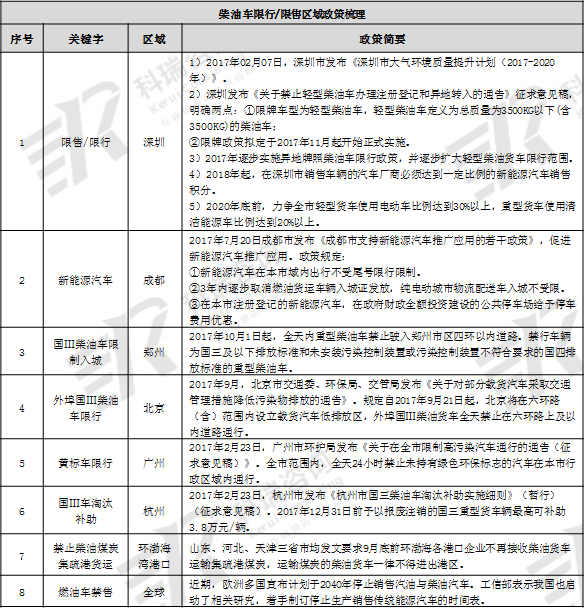 2016年下半年多项行业政策发布,除了国五排放的实施外,其中影响最大的既是“限柴”政策的陆续出台。当然“限柴”是货车限制政策的一个简称,在深圳、成都、杭州等七个市、区陆续出台针对轻重卡限制的政策。包括:限行、限购、黄标车淘汰、电动卡车比例等一些列针对性政策。统计如下: