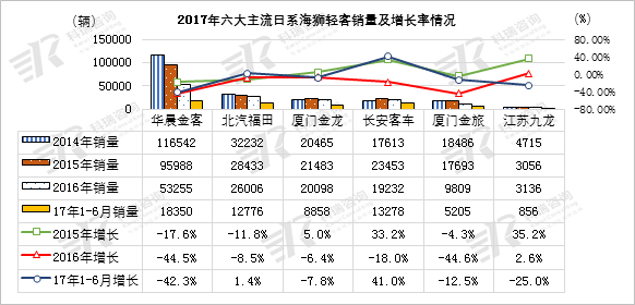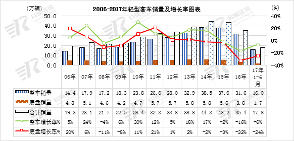 2017年6月,全国共18家主流与非主流轻型客车生产企业,共销售轻客 31224辆,同比增长14.4%;1-6月,累计销售150404辆,累计同比增长-6.3%,其市场销量增幅持续下滑二年半,其中以日系轻客与各类底盘销量以2位数的下降率最为显著。若依此市场下跌之惯性,下半年的市场预期也不容乐观,除非有政策上的利好出现,否则难挽其颓势。