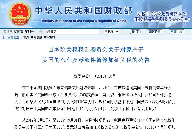 在二十国集团领导人布宜诺斯艾利斯峰会期间,习近平主席应邀同美国总统特朗普举行会晤,就中美经贸问题达成了重要共识。为落实两国元首共识,根据《中华人民共和国对外贸易法》《中华人民共和国进出口关税条例》等法律法规和国际法基本原则,国务院关税税则委员会决定对原产 [详细]