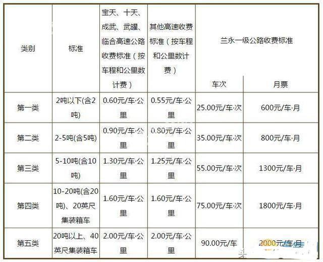 从上图可以看出,甘肃高速货车车型共分为5类,按车型和公里数来计费:车型×行驶里程×费率。与货车的实际载重没有关系,就是说同一车型的空载货车和重载货车收费很有可能是一样多,尤其是5类车,20吨和40吨、50吨、60吨的收费是一样多,很容易诱发超限超载。