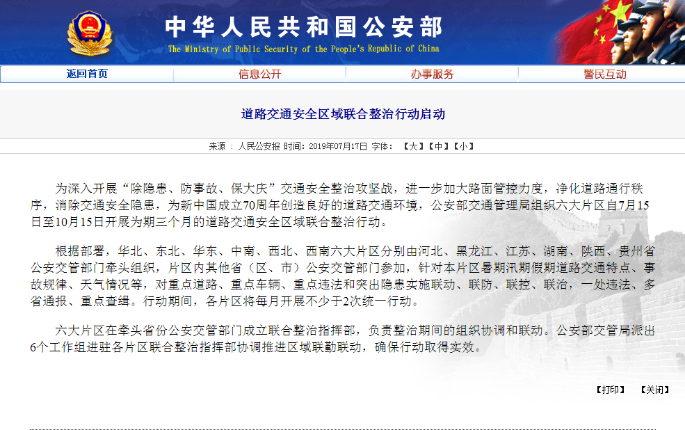 为深入开展“除隐患、防事故、保大庆”交通安全整治攻坚战,进一步加大路面管控力度,净化道路通行秩序,消除交通安全隐患,为新中国成立70周年创造良好的道路交通环境,公安部交通管理局组织六大片区自7月15日至10月15日开展为期三个月的道路交通安全区域联合整治行动。 [详细]