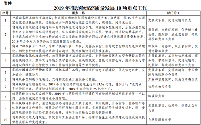(五)促进现代物流业与制造业深度融合。加强生产服务型国家物流枢纽建设,利用枢纽聚集的大量物流资源,为制造企业提供高效快捷的物流服务,降低制造企业物流成本,提升区域制造企业竞争力,支撑制造业高质量集群化发展。以深化实施“互联网+”高效物流和物流降本增效专项行动为突破口,促进物流业与制造业深度融合创新发展。研究出台促进物流业与制造业深度融合发展的政策措施,鼓励物流企业为制造企业量身定做供应链管理库存、“线边物流”、供应链一体化服务等物流解决方案。实施服务型制造示范遴选,支持物流企业开展服务化转型。增加开行面向大型厂矿、制造业基地等的“点对点”直达货运列车,提高协议制运输比重,扩大大宗物资运量运能互保协议范围,2019年力争达到25亿吨左右。加快发展面向集成电路、生物制药、高端电子消费产品等高附加值制造业的航空货运服务,加大“卡车航班”开行力度,构建高价值商品的快捷物流服务网络。(发展改革委、交通运输部、工业和信息化部、民航局、铁路总公司负责)