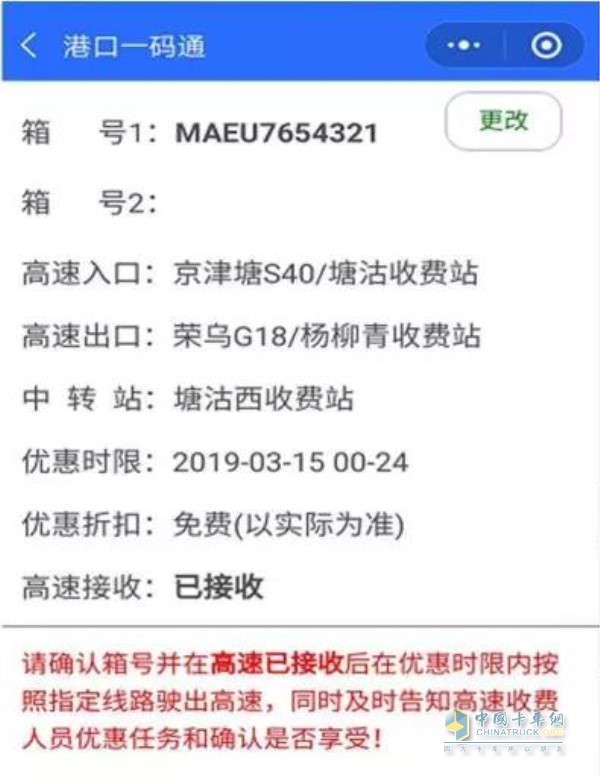 要享受通行费优惠,车辆需要满足几个条件,首先必须要通行规定中的几个高速收费站,其次必须是去天津港进行集装箱运输作业的车辆,最后车辆必须提前备案。