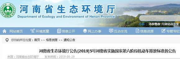 河南省生态环境厅办公室4月26日印发了《河南省生态环境厅公告[2019]5号河南省实施国家第六阶段机动车排放标准的公告》,公告明确表示: