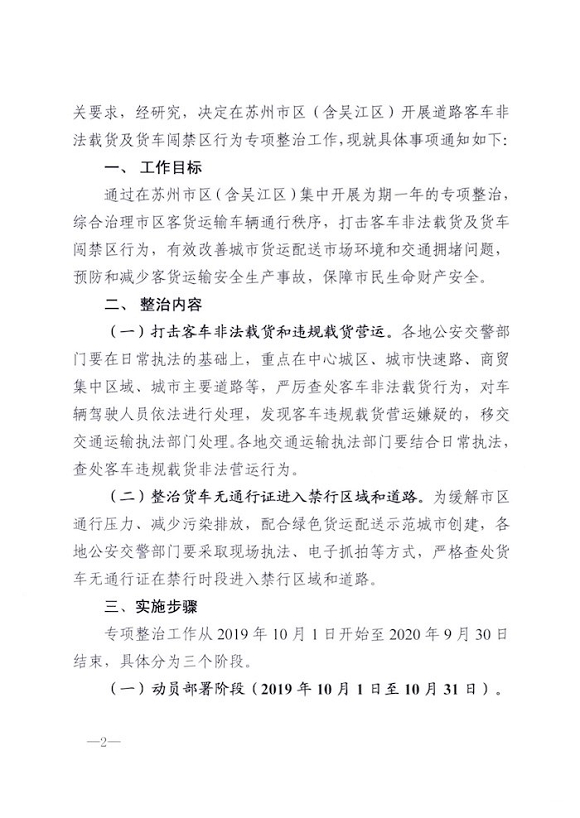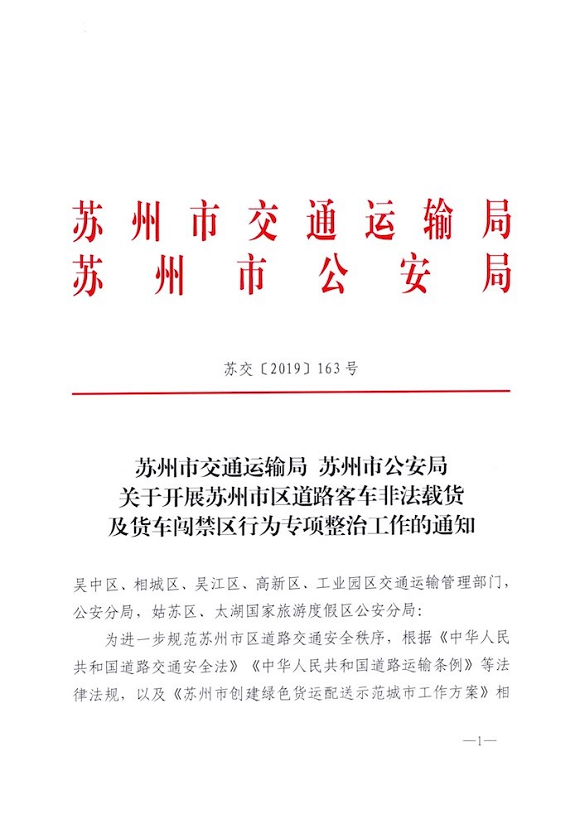 近期苏州市交通运输局、公安局印发《关于开展苏州市区道路客车非法载货及货车闯禁区行为专项整治工作的通知》。《通知》表示,将在苏州市区(含吴江区)集中开展为期一年的专项整治、综合治理市区客货运输车辆通行秩序。