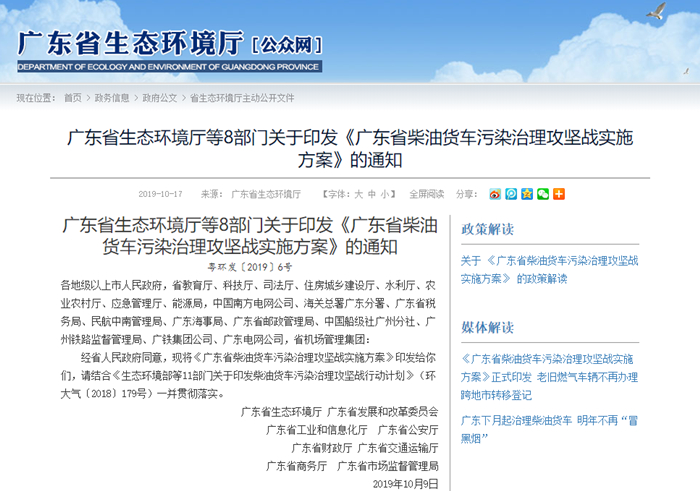 10月17日,广东省生态环境厅等8部门关于印发《广东省柴油货车污染治理攻坚战实施方案》的通知。通知指出,鼓励各地级以上市采取措施加快淘汰国三及以下排放标准的柴油货车、采用稀薄燃烧技术或“油改气”的老旧燃气车辆。公安交管部门对上述车辆不再办理跨地市转移登记业务。依法划定禁止冒黑烟等可视污染物车辆行驶的区域,基本消灭黑烟车。