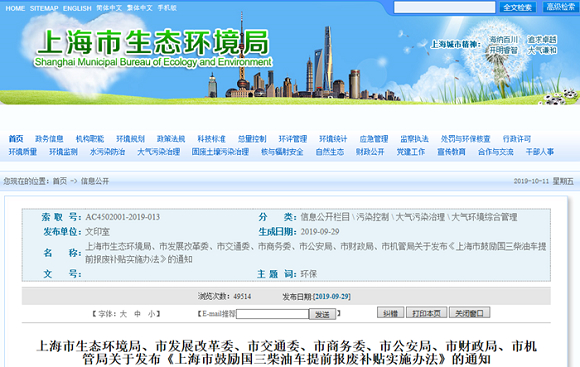 为改善本市大气环境质量,进一步减少机动车污染排放,加快淘汰高排放在用老旧柴油车,鼓励国三柴油车提前报废,上海市生态环境局会同市发展改革委、市交通委、市商务委、市公安局、市财政局、市机管局等单位联合制定了《上海市鼓励国三柴油车提前报废补贴实施办法》,并经市政府同意,现予以发布,自2019年10月1日起施行。