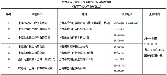 市生态环境局会同市商务委、市公安局、市财政局、市交通委指导第三方机构在本市各机动车拆解企业所在地设立“上海市国三柴油车提前报废补贴申请受理点”(见附件2)开展相关工作。
