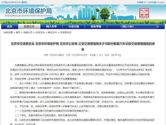 11月1日起,被称为“史上最严的外地车限行政策”将在北京正式实施。《北京市关于对部分载客汽车采取交通管理措施的通告》(以下简称《通告》)中规定:每辆外地牌照车辆一年中只可办理12次“进京证”,每次核发的“进京证”最长使用期限为7天,外埠客车限行区域延伸至北京六环路(不含)和通州区全域(不含高速公路主路)。在“进京证”有效期届满前,车辆应驶出限行范围,否则将根据停放天数相应扣减当年可办理进京通行证的天数。