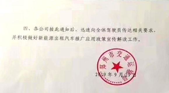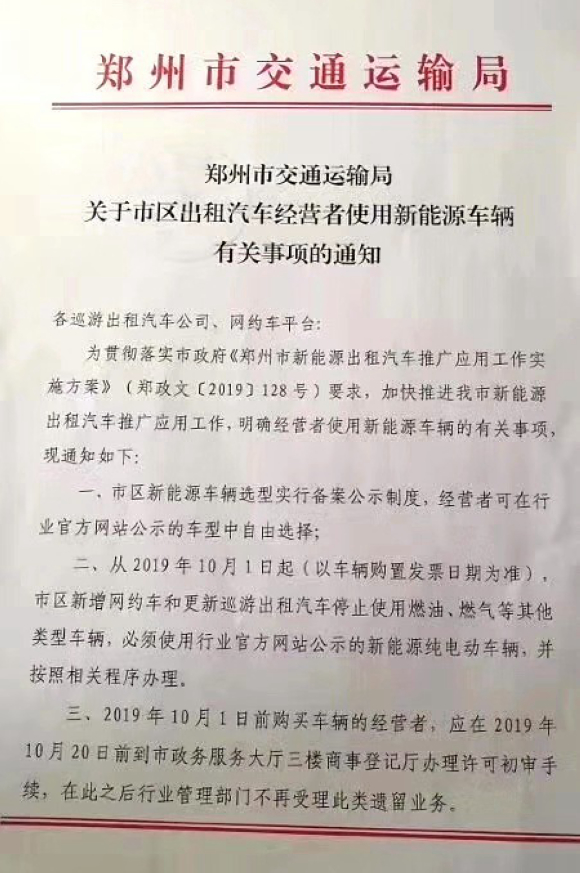 郑州:10月1日起新增网约车必须为纯电动汽车