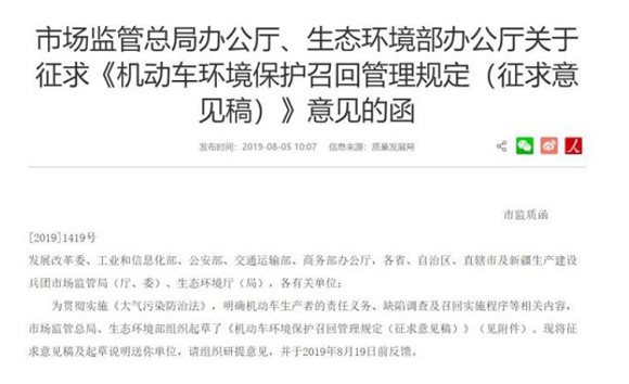 近日,中国人民共和国生态环境部下发关于征求《机动车环境保护召回管理规定(征求意见稿)》意见的函,并向各个相关单位征求意见,所提意见须于2019年8月19日前反馈。 据了解,《机动车环境保护召回管理规定(征求意见稿)》共分为总则、信息系统与信息管理、调查与认定、召回实施与管理等六个章节的内容。明确了机动车因环保缺陷召回的流程与法律依据。 [详细]
