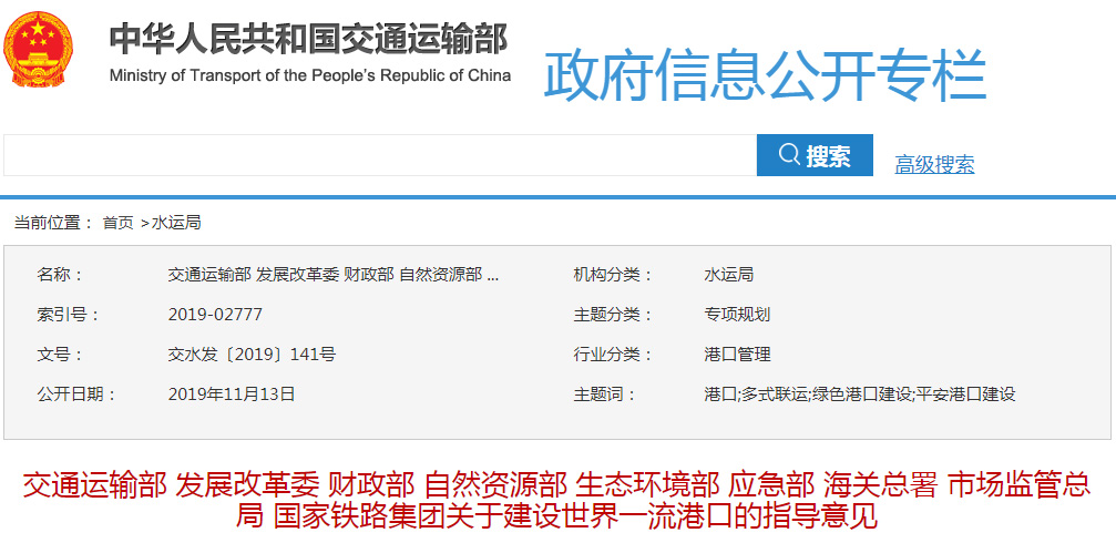 据电车资源了解,11月13日九部委联合发布《交通运输部 发展改革委 财政部 自然资源部 生态环境部 应急部 海关总署 市场监管总局 国家铁路集团关于建设世界一流港口的指导意见》(以下简称“意见”)。