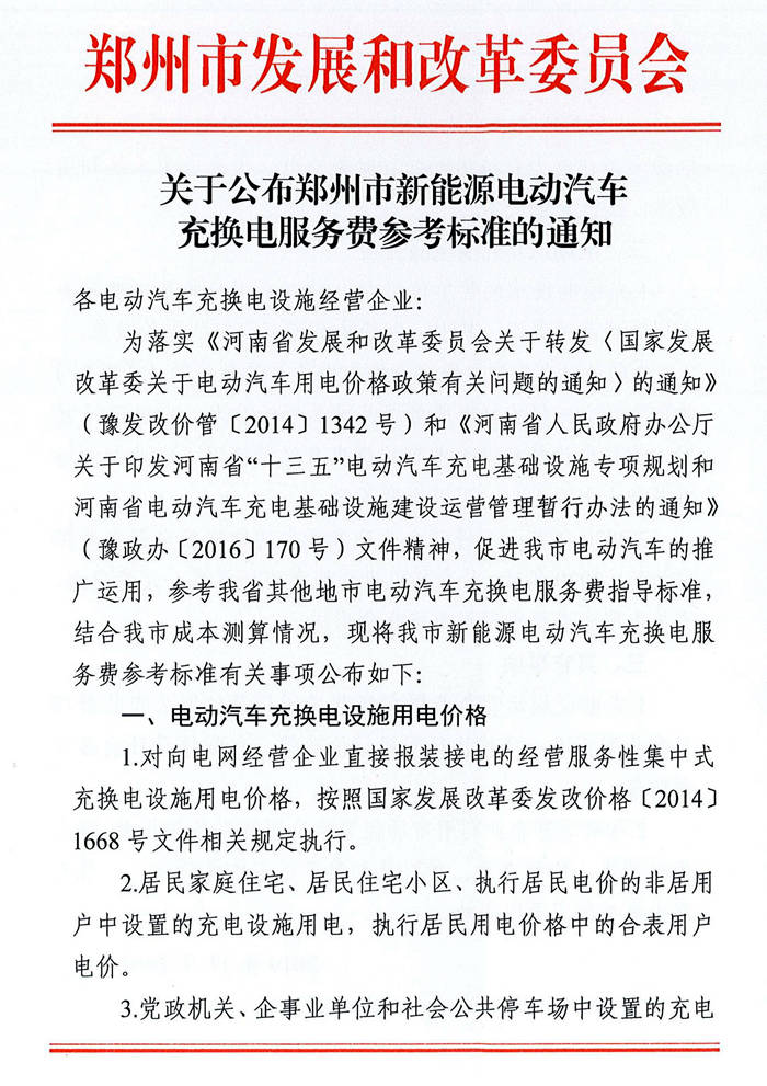 郑州市发展和改革委员会近日发布《关于公布郑州市新能源电动汽车充换电服务费参考标准的通知》。通知规定了郑州新能源汽车充换电服务收费统一参考标准。