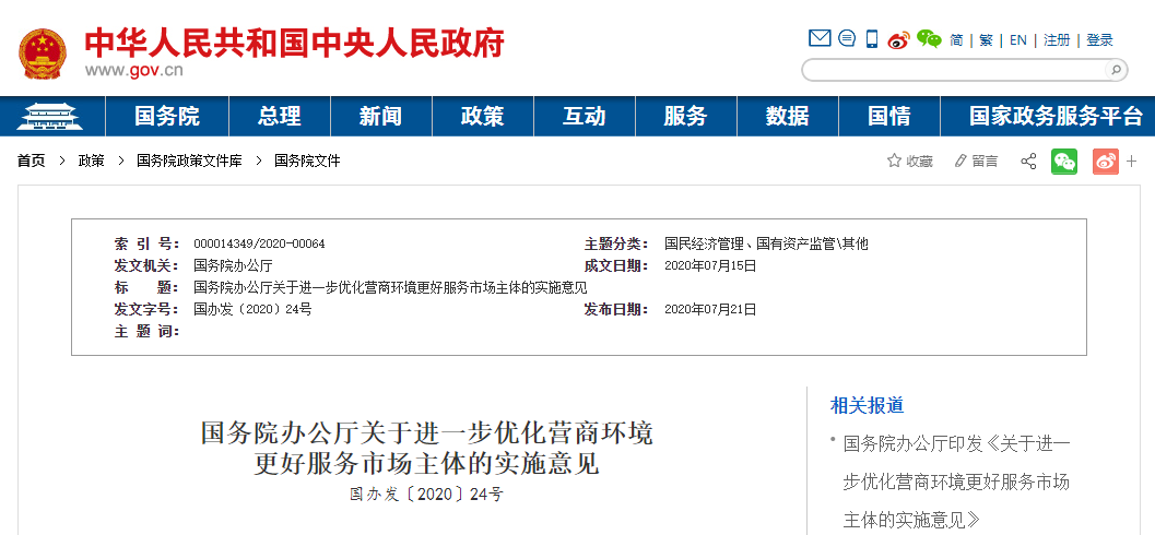 党中央、国务院高度重视深化“放管服”改革优化营商环境工作。近年来,我国营商环境明显改善,但仍存在一些短板和薄弱环节,特别是受新冠肺炎疫情等影响,企业困难凸显,亟需进一步聚焦市场主体关切,对标国际先进水平,既立足当前又着眼长远,更多采取改革的办法破解企业生产经营中的堵点痛点,强化为市场主体服务,加快打造市场化法治化国际化营商环境,这是做好“六稳”工作、落实“六保”任务的重要抓手。为持续深化“放管服”改革优化营商环境,更大激发市场活力,增强发展内生动力,经国务院同意,现提出以下意见。