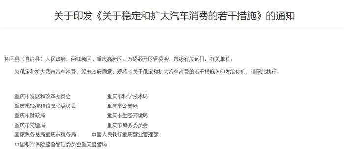 记者日前从重庆市发改委获悉,重庆市发改委等11部门联合发布了关于印发《关于稳定和扩大汽车消费的若干措施》的通知。
