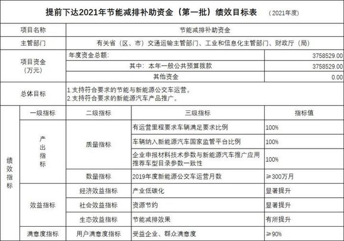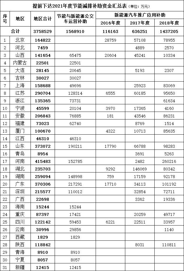 11月20日,财政部发布的《关于提前下达2021年节能减排补助资金预算(第一批)的通知》表示,财政部提前下达省(区、市)2021年节能减排补助资金,用于2019年度节能与新能源公交车运营补助资金、2016-2018年度新能源汽车推广应用补助资金清算。2021年共安排新能源汽车补贴375.8529亿元,详细情况如下表: